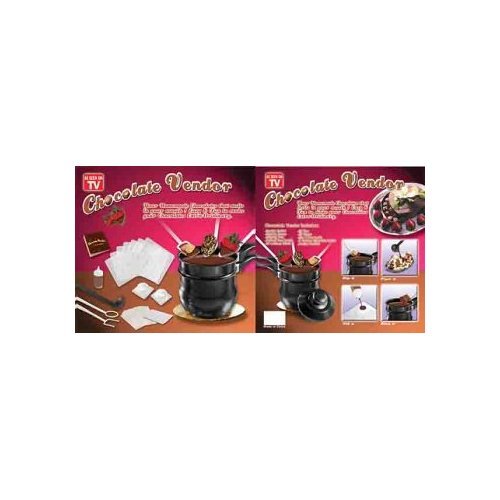 Chocolate Vendor Comes with the same parts as the original chocolate factory, but in a different box (packaging). The Chocolate Vendor is the same double boiler as the Original Chocolate Factory. Chocolate Vendor enables the creation of chocolate coated treats like fruits, nuts, cakes and other desserts, and comes with a vartiety of different themed molds to create chocolate treats like lollipops and candies. Included in the Chocolate Vendor: Double Boiler Dipping Spoon Dipping Fork 25 Lollipop sticks 25 Candy Bags 25 Twist Ties Decorator Bottle 8 Designer Molds Ladle